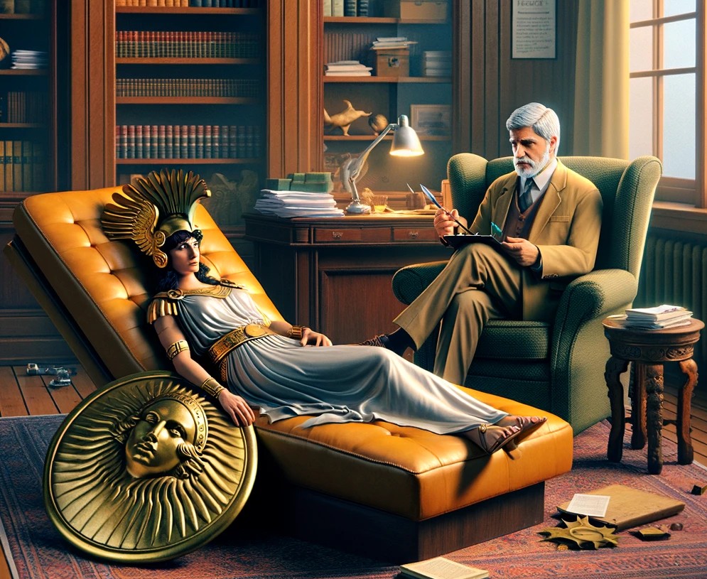 Athena havde hængt med hjelmen en tid, og det var begyndt at bekymre plejehjemsledelsen. Medicinering var ikke populært på stedet – bivirkninger er i en kategori helt for sig, når det drejer sig om guder – og på et gruppemøde blev det besluttet, at lade Dr. Zeuberkrank tage sig af sagen. Han var kendt som den ubetinget bedste psykiater for særlige tilfælde, og man fik en aftale om, at han kunne komme – formedelst et betragteligt honorar. Athena forsøgte at protestere, men fik at vide, at det var til hendes eget bedste. Så hun kom – om end noget modvilligt – til dr. Zeuberkranks kontor en ganske almindelig onsdag.